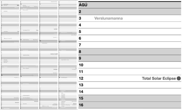 This will be our 10th year of creating large, A-series wall calendars. A PHP script generates SVG output, which we edit into a PDF for print. The calendar includes Icelandic holidays, old Icelandic months, Icelandic Yule Lads, full moons, equinoxes, solstices, a solar eclipse and more. Add your own holidays and translations!
